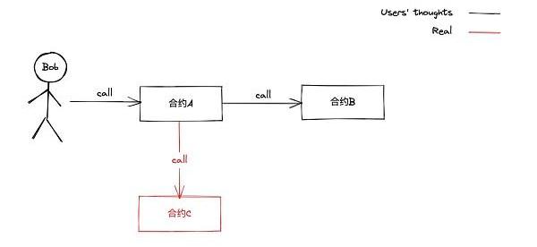 大家还记得之前几期部署攻击合约时我们会传入目标合约的地址,在攻击合约中就可以调用目标合约中的函数吗,有些攻击者会利用这一点受害者。比如部署一个A合约并告诉受害者我们会在部署A合约的构造函数中传入B合约的地址并将B合约开源,其实我们会在部署A合约时传入C合约的地址,如果受害者完全信任我们没有检查部署A合约的那笔交易,我们就完美的将恶意代码隐藏在了C合约中。我们可以从下图来理解这个逻辑: